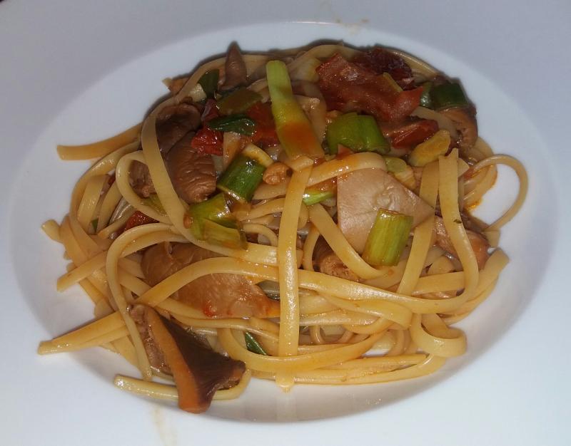 Heute gab es Bavette mit Lauchzwiebeln, Austernpilzen und getrockneten Tomaten.