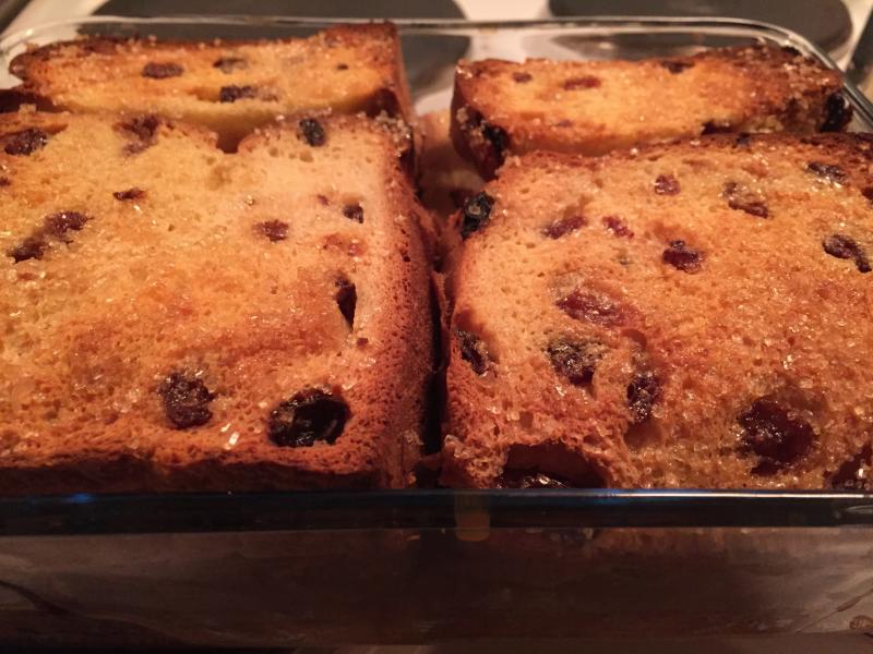 hier gab es süßen auflauf von altbackenem rosinenbrot.