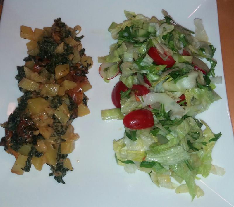 Heute gab es Spinat und Kartoffeln mit Käsesoße überbacken, dazu Salat mit Gurke, Tomate und Rucola.