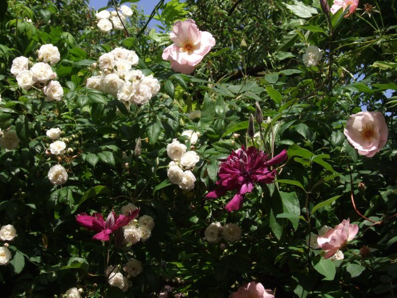 Hier muss sich eine alte, einmal blühende Kletterrose, die Pergola mit einem Winterjasmin teilen.