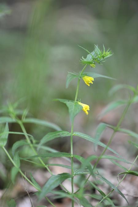 Ich habe gerade heute entdeckt, dass es mir gelungen ist, den Wachtelweizen, der hier gerne auf schütteren Grasrändern in den Kiefernwäldern wächst, in den Vorgarten einzuladen. Letztes Jahr hatte ich ein paar blühende Pflanzen samt Substrat entfernt und soweit es ging auch Samen gesammelt (wenige, sehr wenige). Wie nicht anders zu erwarten welkten die Pflanzen schnell dahin. Heute nun wollte ich das waldige Gras unter der Kiefer etwas kürzen, bei der Gelegenheit Eichelsämlinge entfernen und Spierenausläufer kürzen. Gerade als ich die Handsichel schwingen wollte, blitzte es sehr gelb aus dem Gras.
