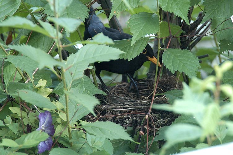 Fortsetzung zu dem Amselnest in Posts #79 #90 #144:Hier hat der Amselvater die Ämselin mal abgelöst ... er scheint sie auch regelmäßig zu füttern.Heute mussten wir recht oft am Nest vorbei. Ich möchte wissen, was sie von uns denken.Lieben GrußThomas