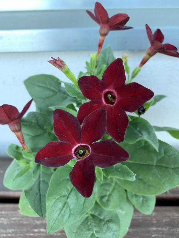 Diesen samtigen Rotton habe ich bei Ziertabak noch nicht gesehen. Die Pflanze durfte mit. 8)