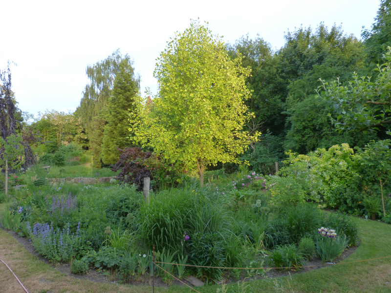 Liriodendron tulipifera 'Aureomarginatum' ist momentan wahrlich auffallend - jeweils zum Tagesausklang setzt ihn die Abendsonne in Szene, während die Beete darunter schon im Schatten liegen.