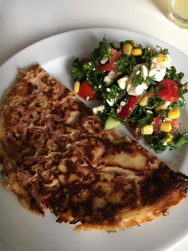 Pfannkuchen mit Schinken, Käse, Giersch, Bärlauch, Löwenzahn, Petersilie. Dazu Salat mit den gleichen Kräutern plus feingehackter Grünkohl