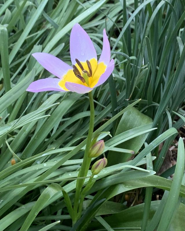 Nun eine Frage: könnte das T.bakeri 'Lilac Wonder' sein🤔 Seit Jahren geistert das auffällige und eigentlich für Tulpen untypische Laub durch den Garten und nie gab es eine Blüte. Jetzt erschien ein Stengel mit drei Knospen: