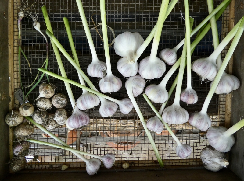 Ich habe Anfang der Woche den Knoblauch geerntet. Aus den im Spätherbst gesteckten Zehen sind walnußgroße Monozehen geworden, aus den im zeitigen Frühjahr nachgesteckten Zehen wurden dicke Knollen.