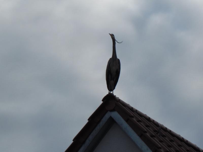 Graureiher mag ich und wenn mal wieder einer von Nachbars Dach in dessen Goldfischpfütze linst, dann hat das was von einem Geier! Direkt anfliegen können sie nicht, in aller Regel landen sie dann aber nach etwas Überlegung irgendwann auf der anderen Seite und laufen ums Haus zum Fressen.