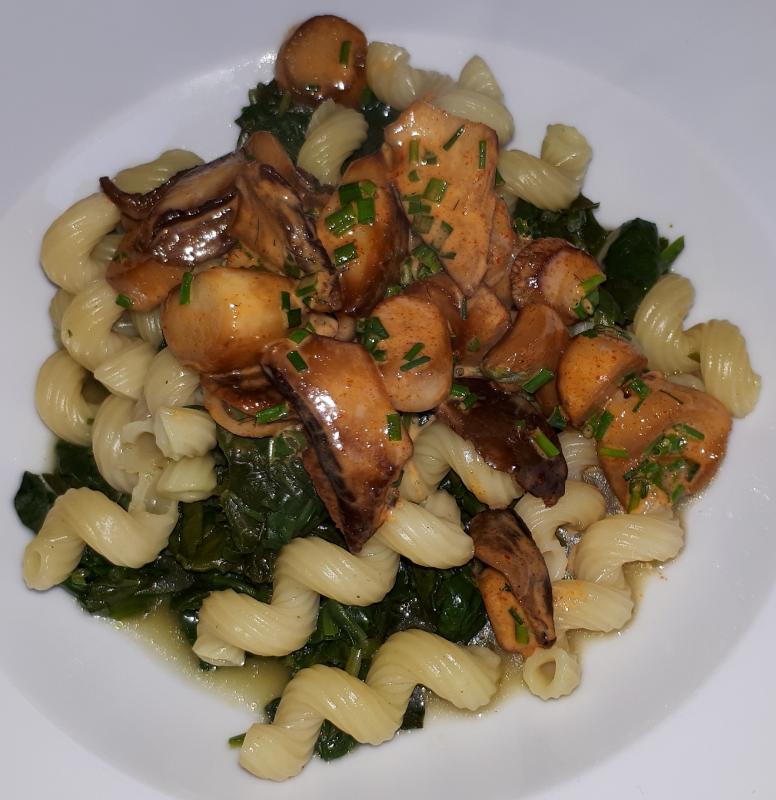 Pasta mit Gartenspinat, Kräuterseitlinge in Sahne, erster eigener Gartensalat