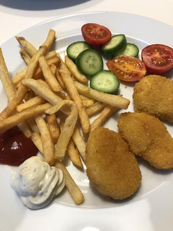 Chicken Nuggets und Pommes, dazu Tomaten und Gurken