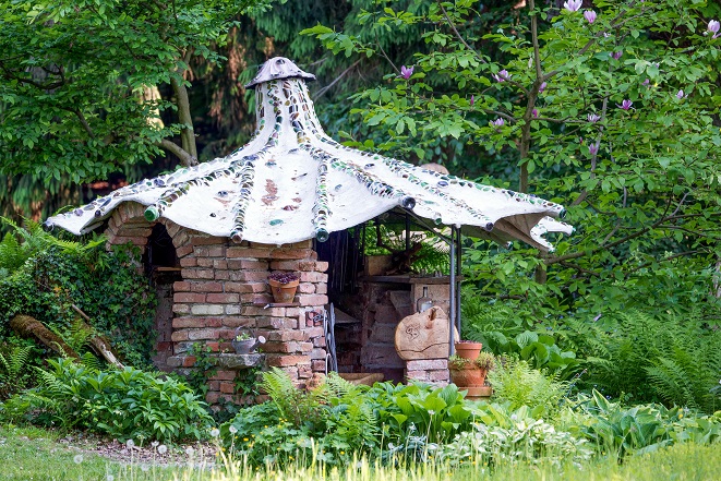 Die Verzierung der Blattrippen mit Glasscherben von Flaschen, auf frostbeständigen Fliesenkleber aufgeklebt, habe ich in Gemeinschaftsarbeit mit meiner Frau gestaltet. In das Dach habe ich außerdem Böden von Sektflaschen als "Dachfenster" in der Schmiede eingearbeitet. Das war's!