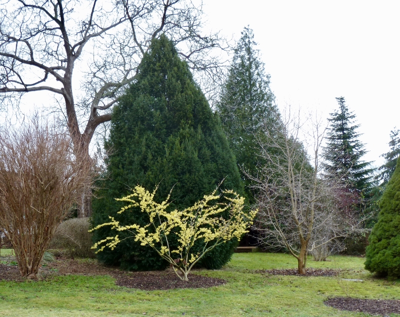 Der Strauch hat rund fünf Meter Durchmesser und ist reichlich zweieinhalb Meter hoch. Dann wären da noch mehrere andere blühende Hamamelis, ein Cercis, zwei Sassafrase, eine große ausgepflanzte Myrte, eine frisch gepflanzte Higankirsche und und und.