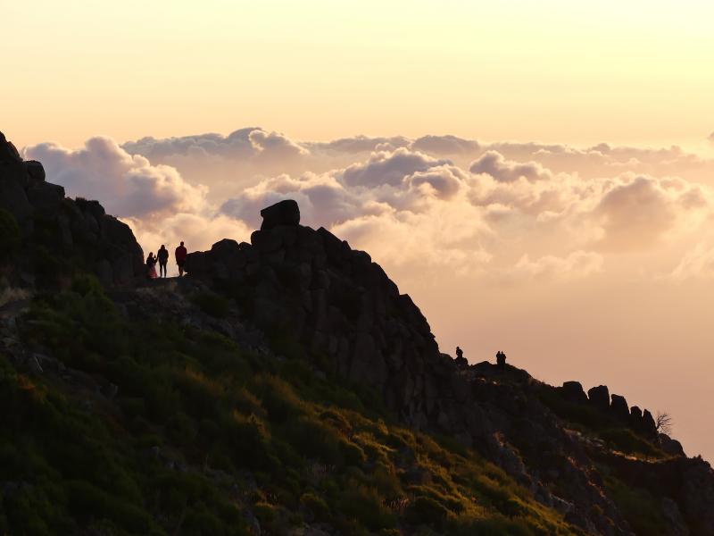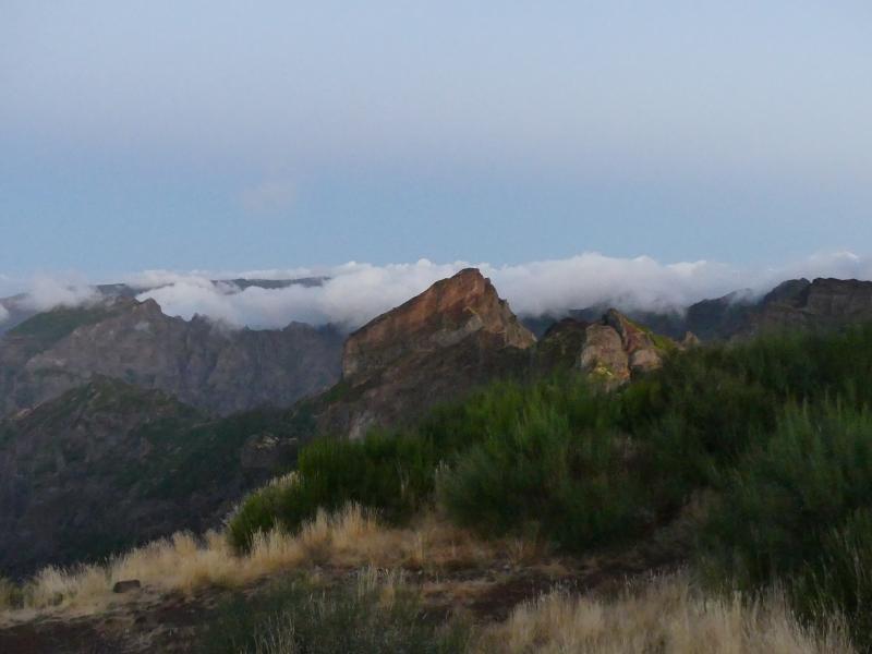 Für den nächsten Tag hatten wir uns ein Highlight der anderen Art vorgenommen. In vielen Reiseberichten wird vom Sonnenaufgang auf dem Pico de Areiero, mit 1818 m Madeiras dritthöchstem Gipfel geschwärmt. Davon wollten wir uns selbst überzeugen. :) Also haben wir bereits an den Tagen davor den Wetterbericht verfolgt, um einen günstigen Tag abzupassen. Gegen 6.20 Uhr starteten wir am Hotel und waren schon eine gute halbe Stunde später an der Aussichtsplattform auf 1810 m Höhe angekommen. Es war windig und ziemlich frisch. Einige Besucher in Sommerklamotten schauten regelrecht neidisch auf lange Hosen und warme Jacken. ;D