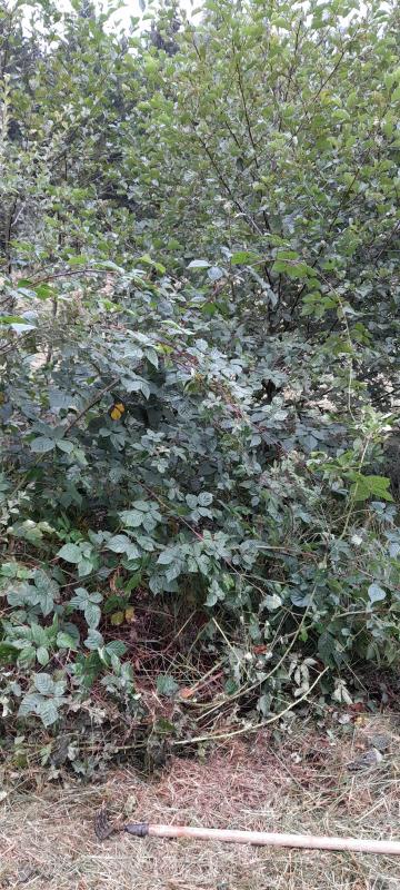 Der Bach soll ausgezäunt sein. Kein Problem. Wenn man aber den Bach mit Erlenzupflanzt, kann man auch nicht mit dem Mäher den Bachbereich pflegen. Dann kommen Brombeeren. Die setzen den Bach zu. Mähen kann man da nicht mehr. Bei dem Wildwuchs zwischen den Bäumen geht genauer gesagt gar nichts mehr. Der Bach sucht sich ein neues Bett. Dazu hat er anmoorigen Boden mitgenommen. Da ist nicht mal mehr ein Netz stellbar. Von Biodiversität reden wir da auch nicht mehr. Rasenschmielen und Flatterbinse, das war´s. Also ich... bin ratlos. Mit viel Mühe mähe ich mit dem Freischneider am unteren Ende ein Bachstück frei. Was viel Arbeit macht, denn die Brombeerranken (zuletzt zurück gesetzt im Juni) sind meterlang und müssen abgetragen werden (wohin denn?!). Andernfalls könnten wir nämlich nicht mal mehr mit der Herde die Bachseite wechseln.