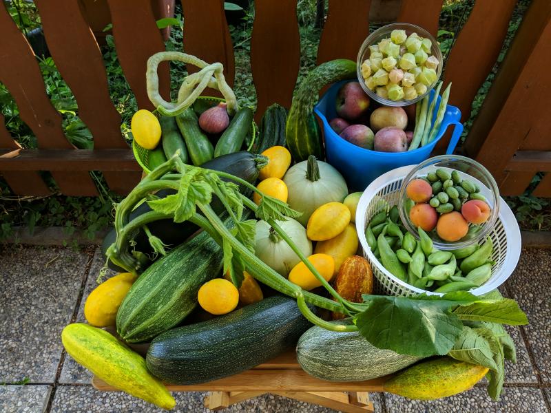 Gurken (minus drei die es nicht aufs Bild geschafft haben), Zucchini, Tomaten, Fisolen, Japanische Weinbeeren, zwei nicht ganz reife Marillen und ein wurmstichiger Apfel der frühzeitig vom Baum gefallen ist.