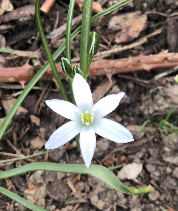 Milchstern, deren Zwiebel sich zwischen Muscari geschmuggelt hat.
