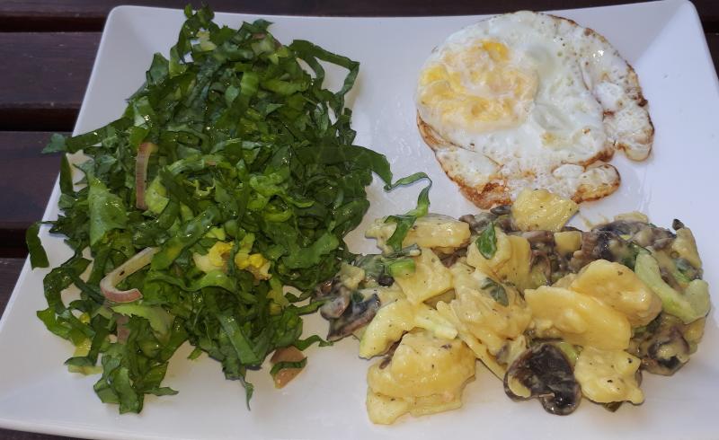 Gestern wsren es hier an die 40°C. Den Kartoffelsalat habe ich mit gebratenen Champignons verlängert, die wegmussten. Dazu gab's Spiegelei (für mich blind gebraten) und der erste Gartenendivien.