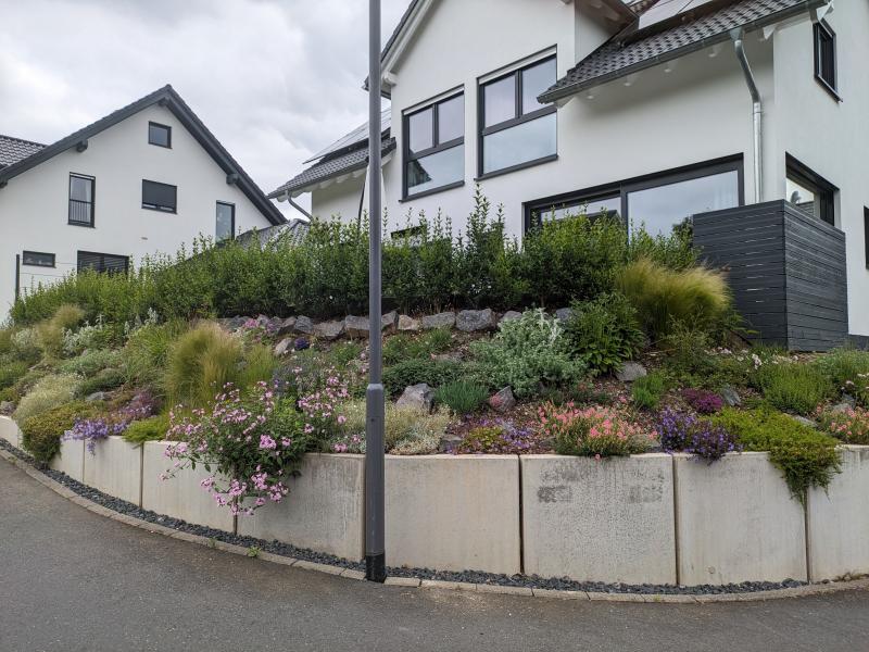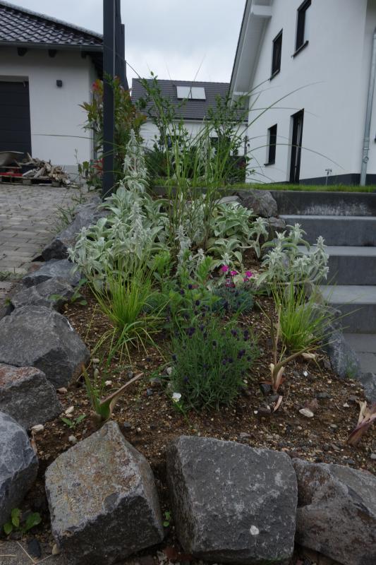 Obwohl der Hang teilweise recht steil ist, gab es kein Problem mit runterlaufendem Wasser, obwohl es manchmal heftig geschüttet hat. Eine mineralische Mulchauflage gibt es nicht, obwohl wir das eigentlich mir feiner Lava geplant hatten. Es war aber im ersten Jahr viel zu Jäten, da fliegt jede Menge von dem unbebauten Grundstück auf der anderen straßenseite herüber. In diesem Jahr ist das schon deutlich weniger, aber es entwickelt sich immer mehr in Richtung geschlossener Pflanzendecke. Das war ursprünglich gar nicht gewünscht, aber inzwischen ist die Erkenntnis angekommen, dass das deutlich pflegeleichter ist.