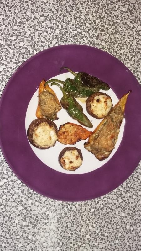 Hier gab es gefüllte Kleinigkeiten: gelbe Spitzpaprika mit einer Hackfüllung (mit Petersilie) und Parmesan; mit Ricotta/Parmesan gefüllte Champignons und grüne Bratpaprika. :D