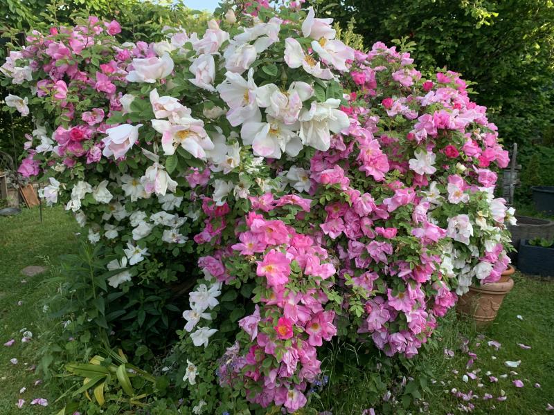 Rocknrollers Plaisanterie, die Mutabilis für Klimabenachteiligte, ist aber auch der Knüller als Kletterrose an der Eingangstür!