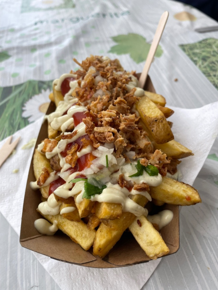 Bei uns gab es zwischendurch Fritten Spezial auf dem Bonner Marktplatz und heute Abend Pasta chi vrocculi arriminati (Pasta mit Blumenkohl, Sardellen, Rosinen und Pinienkernen)