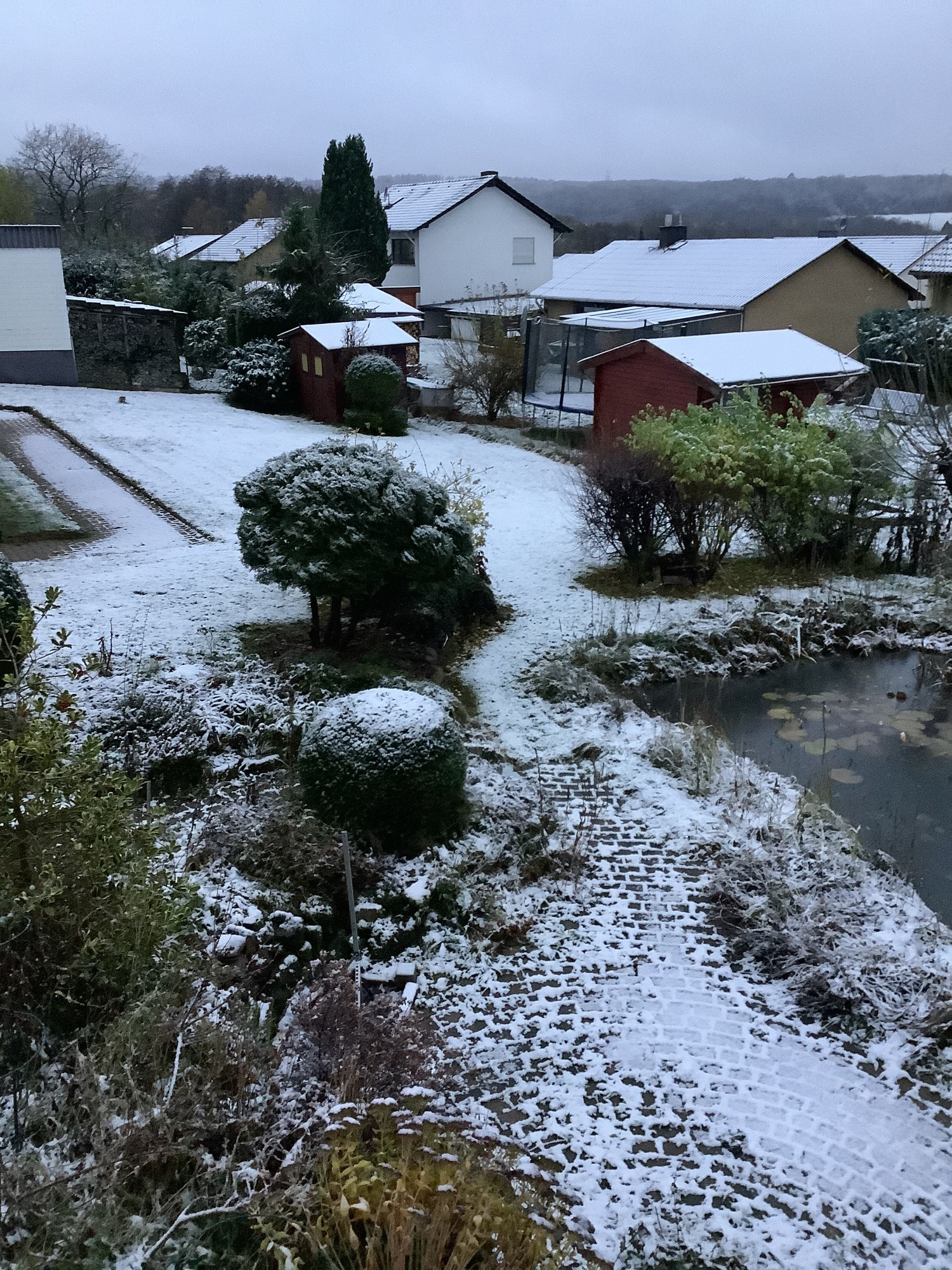 Keine Ahnung, ob zwischen dem vielen Regen gestern Abend und in der Nacht auch Schneeflocken waren. Richtig weiß war hier heute Morgen jedenfalls nichts, nur ganz leichter Reif auf Autos und teilweise Dächern. Dafür zeigt der Niederschlagsmesser 18 mm an. Tmax 4°C, Tmin 0°C.