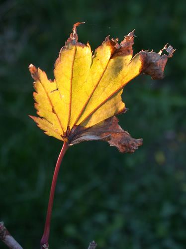 Ein letzter September-Sonnenstrahl beleuchtet ein Ahornblatt von der Rückseite her.