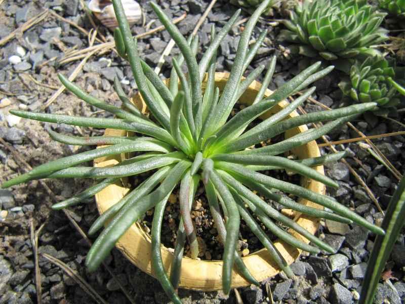 Lewisia rediviva: Die blüht noch nicht, aber ich finde sie auch jetzt schon schön. Jedes Jahr von neuem bin ich von diesem Pflänzchen beeindruckt. Es kommt nach dem Einziehen samt Töpfchen in eine Abseite und dort liegt es rum, bis sich der neue Austrieb zeigt (im Herbst). Dann kommt es wieder an seinen Ort und bekommt im Winter etwas Regenschutz. Jetzt möchte es gerne Wasser bekommen.