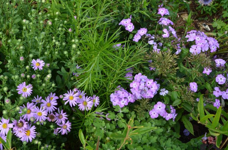 Asternlaub links vom rosa Phlox und zwischen diesem und dem Dunklen, ansonsten Salat, Rudbeckia, Ringelblumen, Ribisl, Kirschbaum, Rosen...