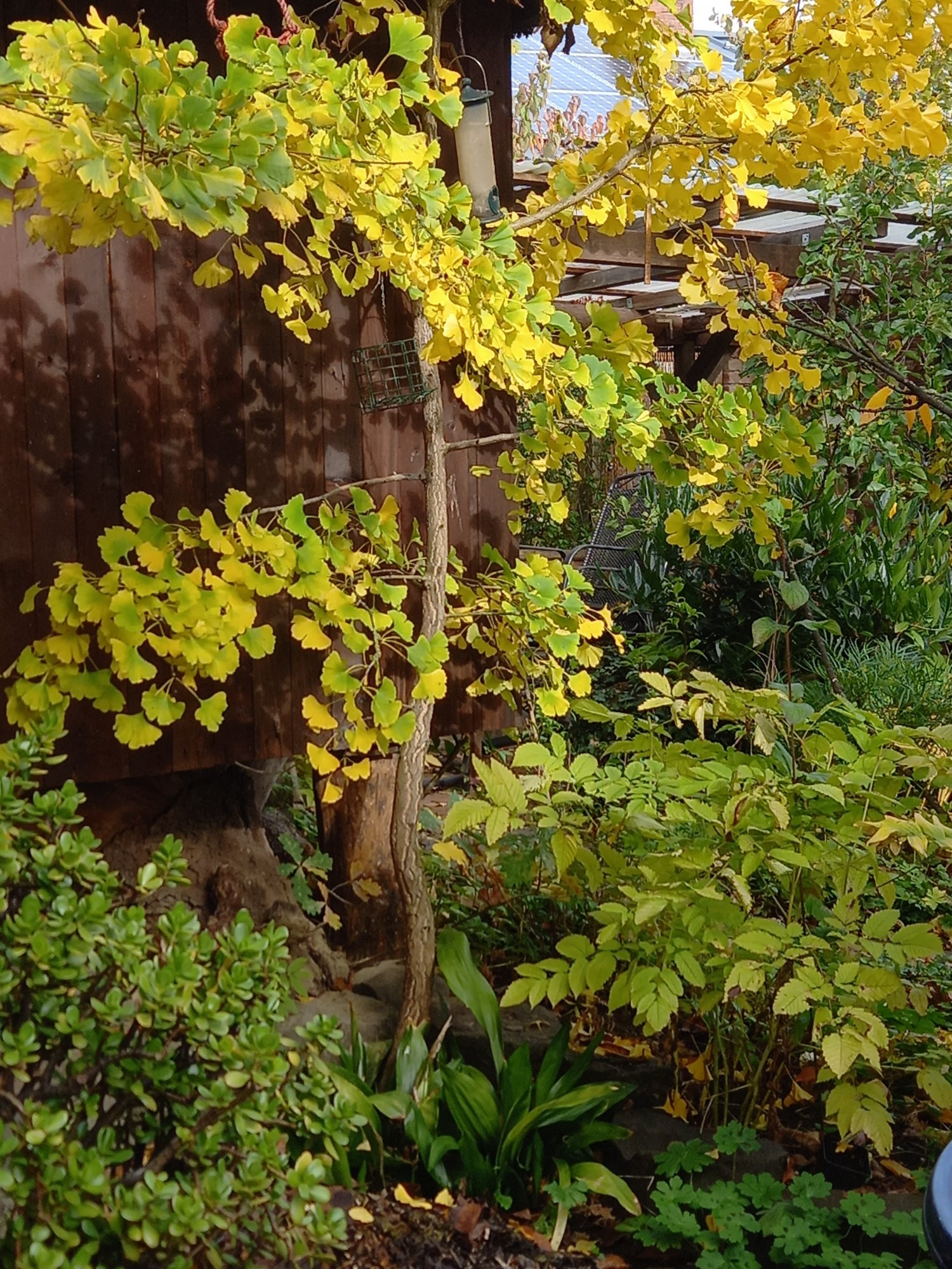 Andererseits gehört es auch die zu den beschaulichen Tätigkeiten im Herbstgaren, Einzelblätter von kleinen Pflanzen jetzt noch abzulesen, so dass sie weiterhin schön frei stehen. Komplett räume ich nur das Paupau-Laub weg, diese Blätte sind als Belag auf den Stauden einfach zu groß. Gingkolaub dagegen ist auf grünem Untergrund sehr dekorativ.