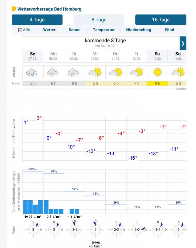 Hier hat sich die Prognose über Nacht merklich verschlechtert. Ende kommender Woche zweistellige Tiefstwerte, auch die Höchstwerte ab Mittwoch deutlich im Minus (WetterOnline), dazu am Donnerstag stürmischer Wind. Es ist überhaupt erst ab frühestens dem 20. milderes Wetter in Sicht. Wäre ja kein großes Problem, wenn hier nicht schon die Knospen angeschwollen wären. Heute und morgen noch mal deutliche Plusgrade.