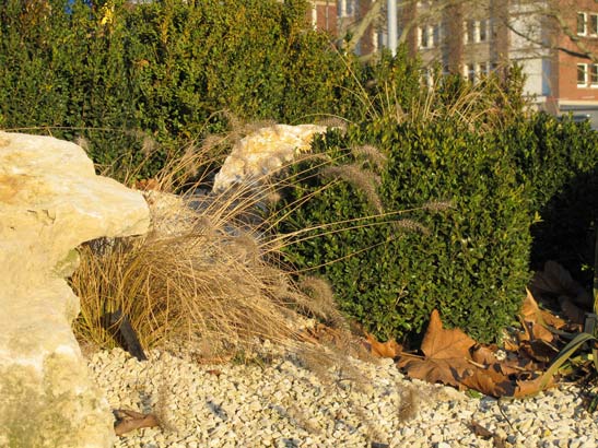 (Das war davor noch ein Riesenhorst.)Pennisetum alopecuroides steht geschützter am Haus: