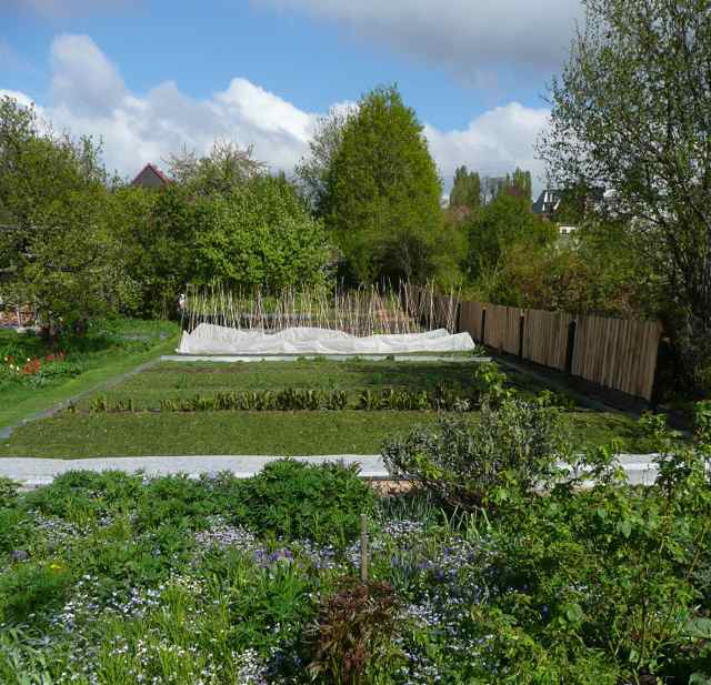 du hast einen Gärtner beschäftigt, gibs zu!Der Gemüsegarten, frisch gemulcht und teilverpackt. (Die Erdbeeren blühen schon, das wäre doof, wenn der Frost sie erwischt. Die Kapuzinererbsen und Zuckerschoten sollen durch das Vlies vor allem vor den Spatzen bewahrt werden, die solange Blättchen von den Pflanzen reißen, bis nichts mehr dran ist. Jetzt kommen sie nicht mehr so gut dran.)