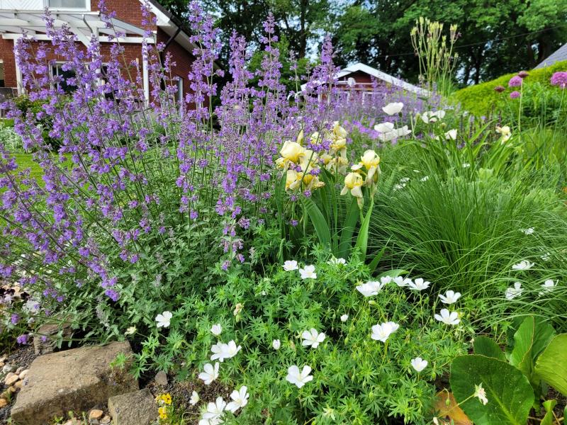 Geranium sang. "Apfelblüte" gefällt mir bisher sehr gut es scheint wirklich sehr flach zu bleiben, erinnert mich bisher an thymian, in der Situation, das es ein kleines Beet ist und nur den Vordergrund abdecken soll sehr wünschenswert ist