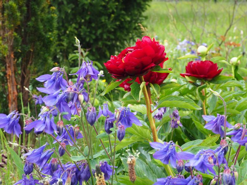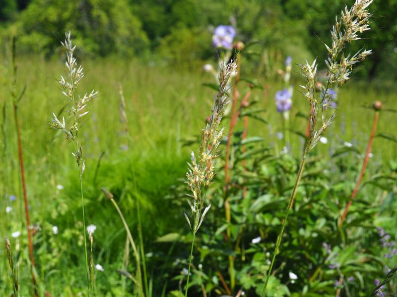 Glatthafer, Arrhenatherum elatius, blüht zwischen Päonien und Schwertlilien.