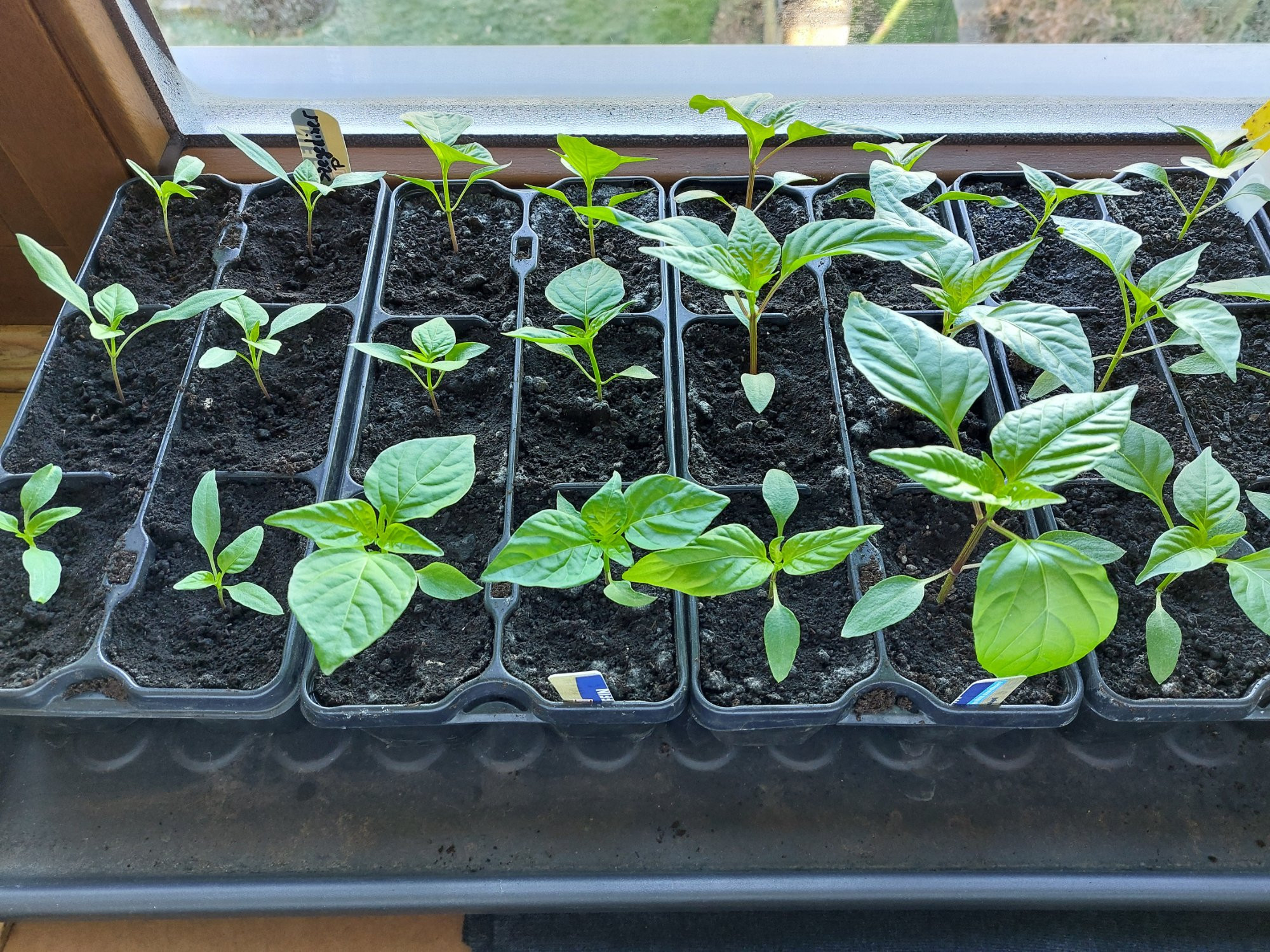 Ich habe Peperonata (grüne, nicht scharfe pfefferoniartige "Bratpaprika") Ende Feb gesät, sie haben jetzt 2-4 echte Blätter. Ich habe sie zu zweit in 9x9 Töpfe pikiert, und sie stehen noch drinnen am SO und SW Fenster, bisher haben sie abends noch Licht bekommen.