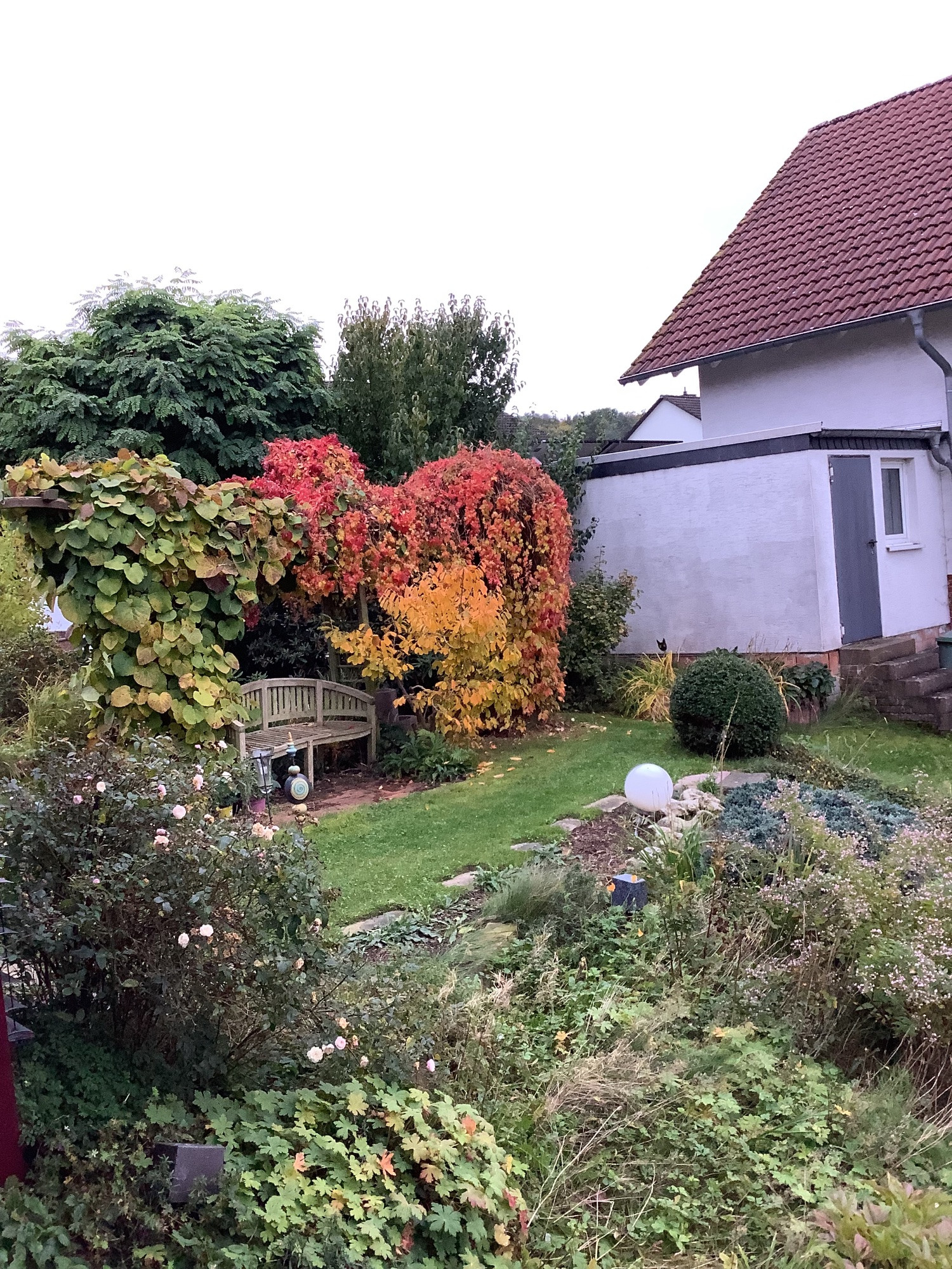 bin bischen spät von der Uhrzeit her mit dem Foto, der wilde Wein leuchtet sehr, davor steht eine Zaubernuß und links eine Pfeifenwinde. Aus den Blättern hat GG schon Geburtstagsgeschenke gebastelt, die Blätter getrocknet und vergoldet, dann gerahmt