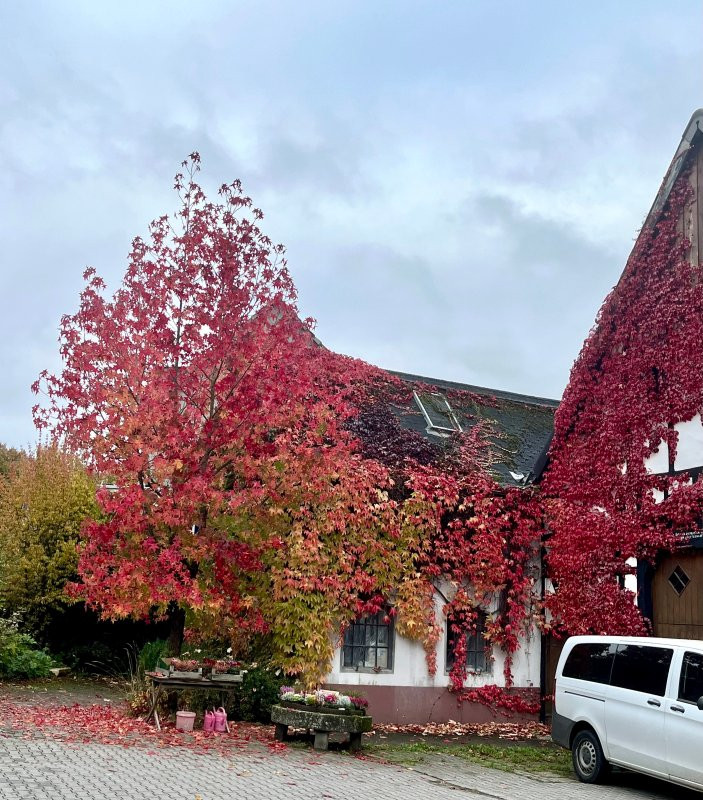 Der hiesige Biobauer hat einen alten Hof, das Fachwerk sieht man leider nicht auf dem Foto, aber den Hausbaum - einen Amberbaum - hat er erst vor ein paar Jahren in den Hof gepflanzt, nachdem ein anderer Baum verstorben war.