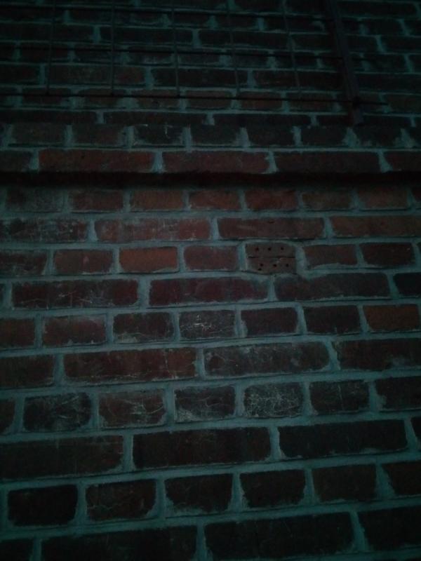 Was jetzt zusammenkommt: An der alten Fassade waren mal über den Daumen 24 bis 30 sogenannte "Rüstlöcher", also ausgelassene Steine um die Rüstung zu ankern. Diese hab ich meistenteils mit 'nem halben Stein einfach verschlossen. Glatt und gut.