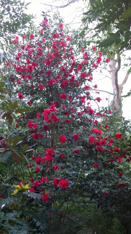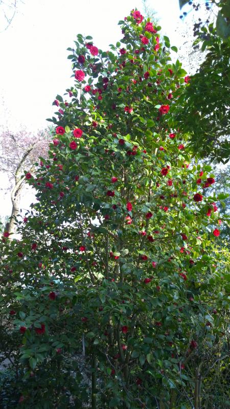 Camellia japonica Tama No Ura direkt vor dem Veranda-fenster hat nach neusten Messungen eine Höhe von 5m. Blüht immer sehr lange, da die Knospen nach und nach aufgehen.