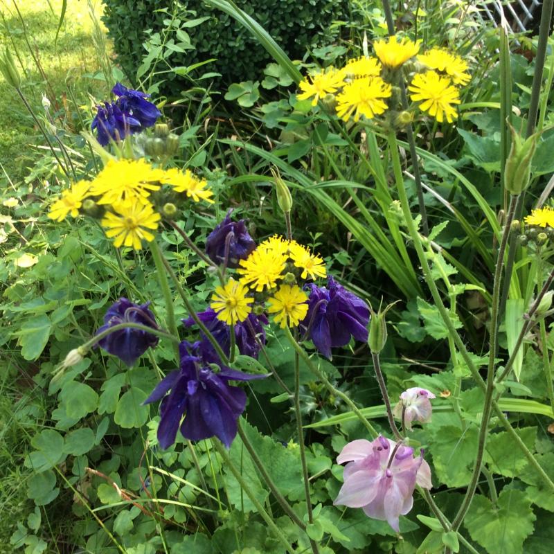 Nachtviolen, Taglilien und bunte Akeleien leuchten in der Sonne.