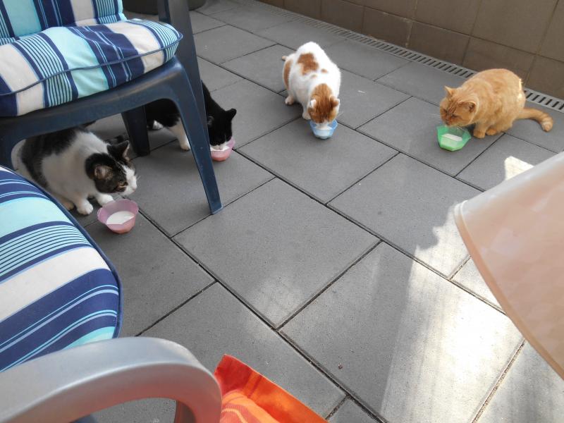 Oh, wie sie alle an ihren Trinknäpfchen hängen, das schaut aus wie in einer Kneipe.