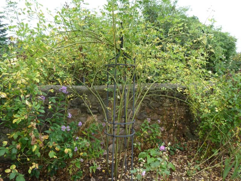 Die Rose 'Mosel'. In anderen Jahren sieht man weder die Mauer dahinter noch das Klettergerüst.