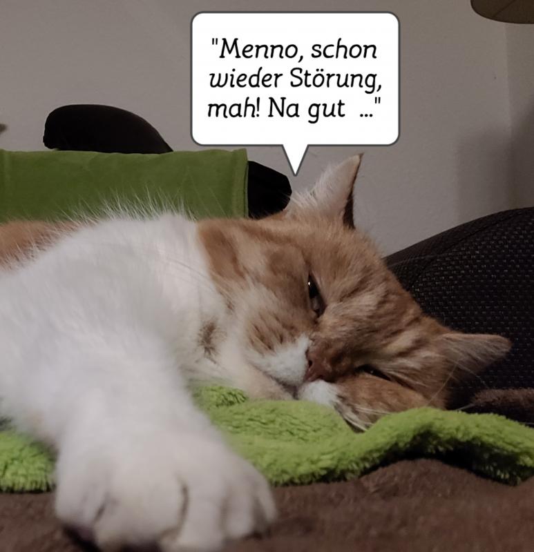 Katzen im Bett sind ja auch so ne Sache.. während Kuno der perfekte Schlafteddy ist (er geht am Abend mit ins Bett, schläft tief, fest und lang ausgestreckt zwischen uns, ohne sichtliche Bewegung und steht morgens mit auf), rutscht Möhre oft dicht ans Gesicht und so ein Fellklumpen zwischen den Lippen ist nicht sonderlich erotisch ::)