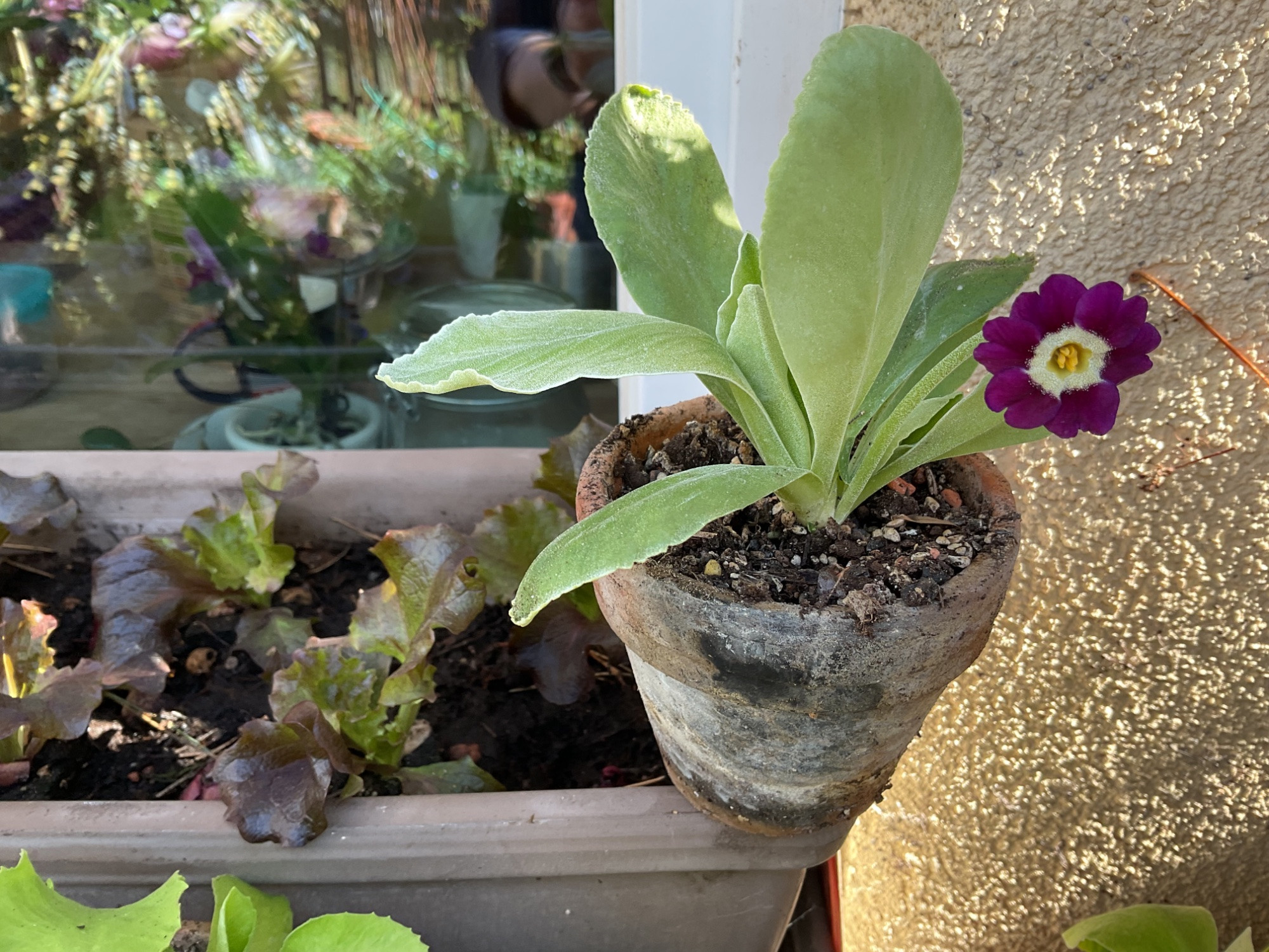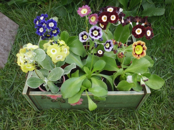 Hier stehen die Aurikel auch in den Startlöchern. Die haben ja den Vorteil, dass man sie gut in Töpfen und damit in Etagen im Regal stapeln kann. Wenn sie dann blühen, kommen sie in schöne alte Tontöpfe und dahin, wo man sie gut sieht, auf den Tisch oder vor den Eingang oder vors Küchenfenster.