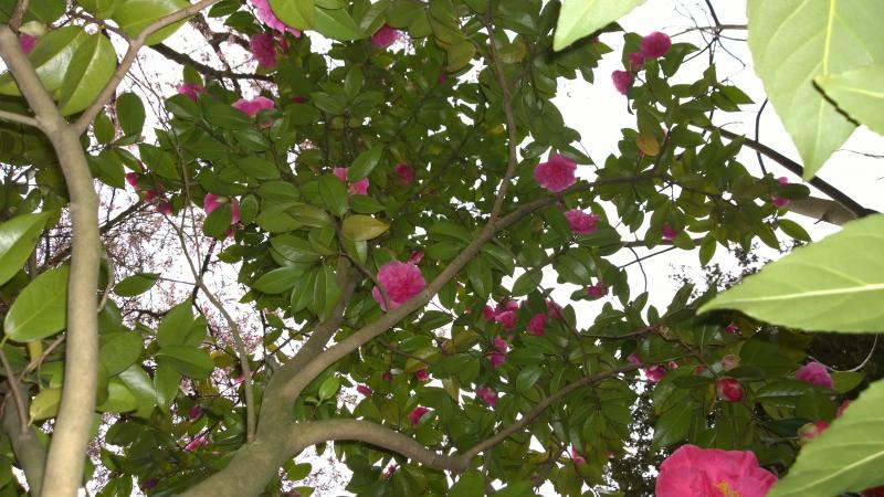 Noch ein Dschungelphoto Camellia japonica Nioi Fubuki, wenn man davor steht und nach oben schaut. Der dicke Stamm ist Ilex cornuta 'Chestnut Leaf' und rechts Illicium henryi, alles wild verwachsen wie im Dschungel ;D