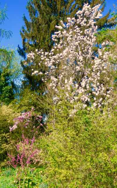 Dreiklang von lilarosa, rosapurpur und weiß: Cercis 'Avondale' (ca.1,90 m), Magnolie 'Pinkie' (ca. 5 m) Und Prunus 'Amanogowa' (ca. 12 m):