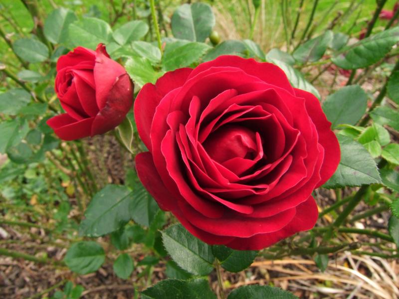 Strauchrose 'Amadeus' leicht überhängend und etwa 1,80m hoch. Der Rotton ist sehr rein und die Blüten habe eine schöne Form.