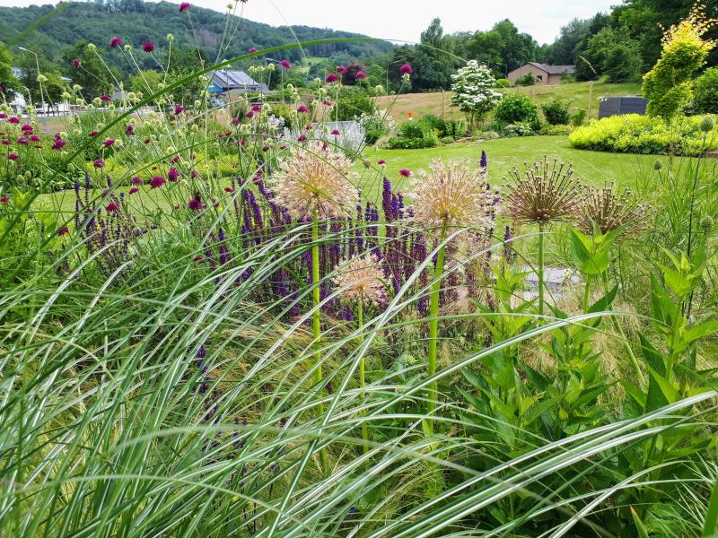 Hier ein zweiblütiges Allium vor Himbeere und Weinrebe.