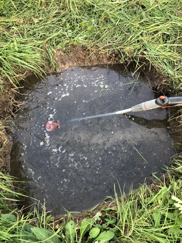 Das mach ich seit den Dürresommern inzwischen immer bei Pflanzlöchern für Bäume und Sträucher, um ein „Feuchtigkeitsreservoir“ unterhalb des Pflanzloches im Boden zu schaffen, Fotos sind vom vorletzten Herbst. Ich hab nie genau geschaut, wie lang es braucht, bis das Wasser ganz in dem 60-70cm tiefen Loch versickert ist, ich kann aber gemütlich in der Zeit eine andere Arbeit erledigen oder ne längere Erholungspause machen :)